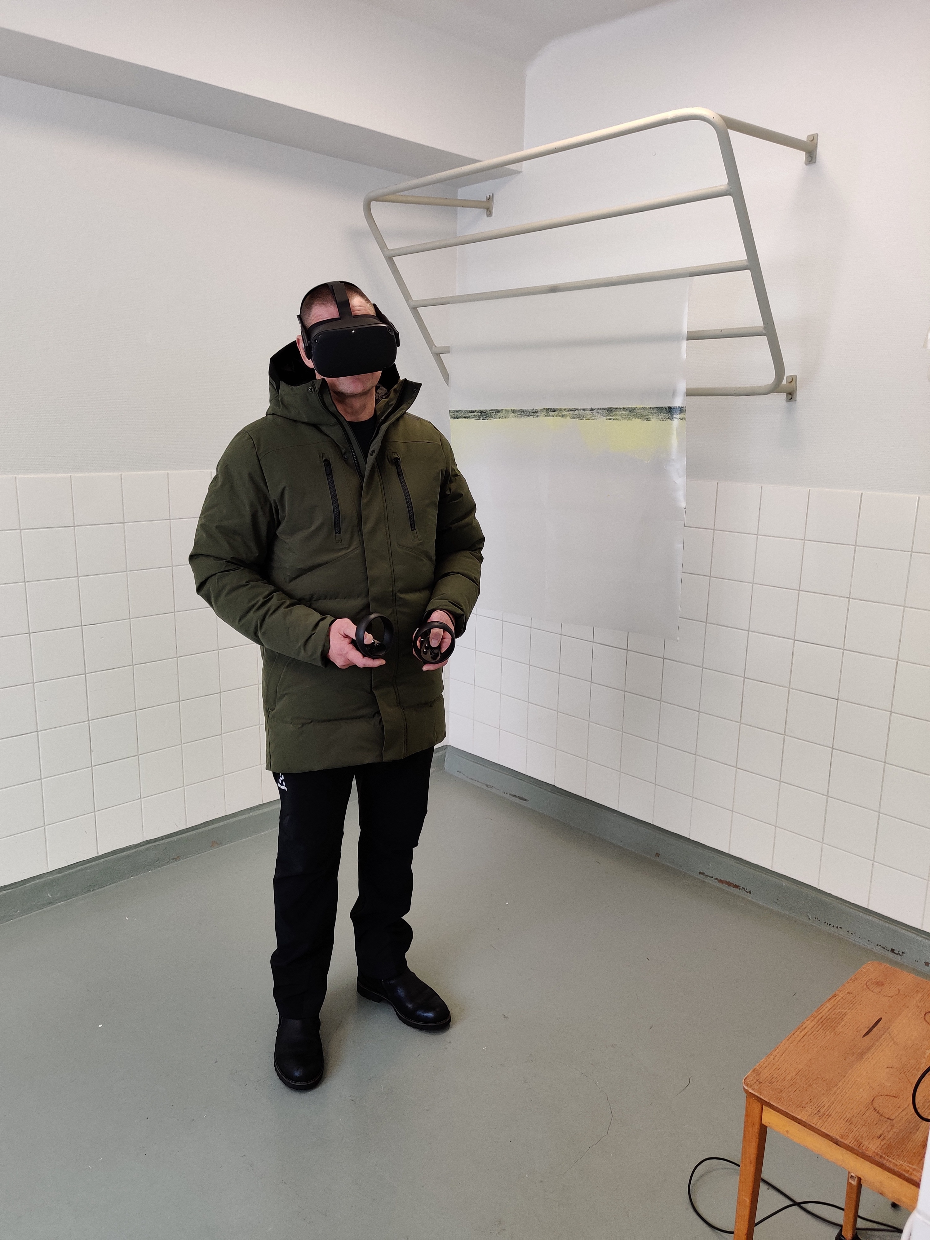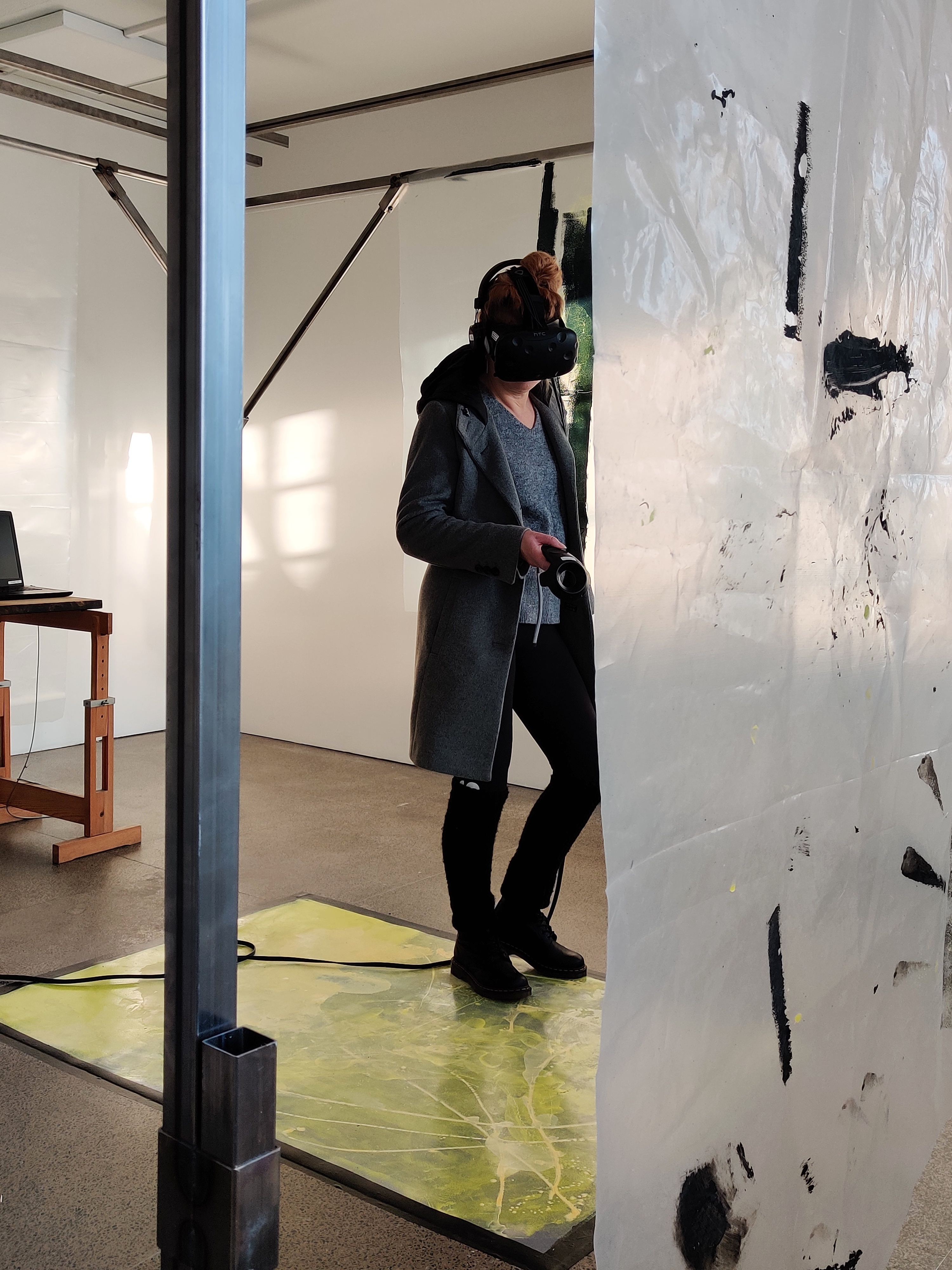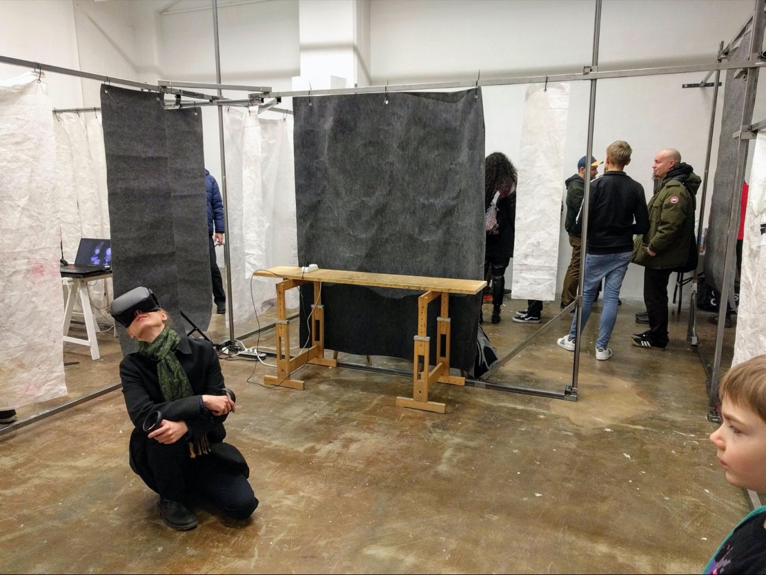 For the exhibition at MUU Cable the gallery space was divided into four parts by a custom made steel frame. Recycled transparent acrylic, carpeting and tarpaulin, were hung from the frame. The colors were neutral; black, grey, wood, steel and dirty white. This aimed both to create a contrast between the somewhat dreary gallery space and the vividly colorful virtual space, and to give some privacy to people using VR-glasses.